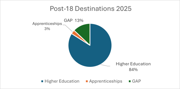 Most students (84%) progressed to higher education, with 79% securing their UCAS first-choice offer. One in five students will study at a Russel Group University, including the Universities of Birmingham, Edinburgh, Durham, Liverpool, Leeds, Sheffield, and Southampton.